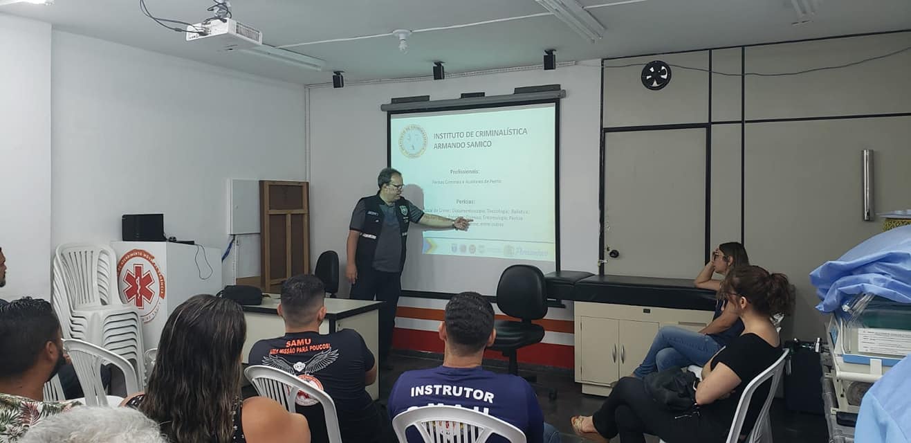 Peritos Criminais da Polícia Científica ministram cursos sobre valorização da prova para os profissionais de saúde do SAMU. O primeiro curso da sequência aconteceu no dia 19/10, e foi ministrado pelo Perito Criminal Dr. Wagner Bezerra. Os cursos têm o objetivo de mostrar a importância da preservação do local de crime durante o socorro as vítimas. A parceria entre a Polícia Científica e o Samu é um importante passo, considerando que profissionais de ambas as instituições atuem em locais de crime. A Polícia Científica de Pernambuco parabeniza todos os envolvidos e agradece a parceria.